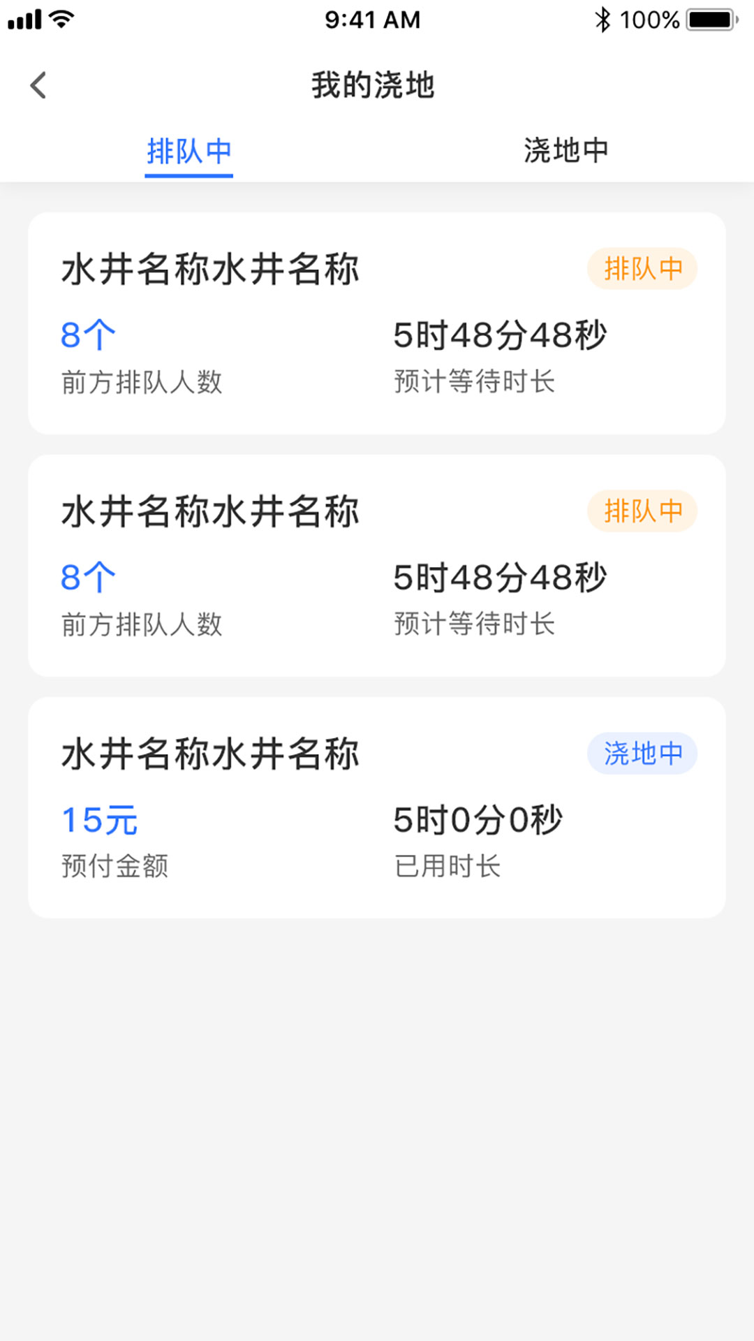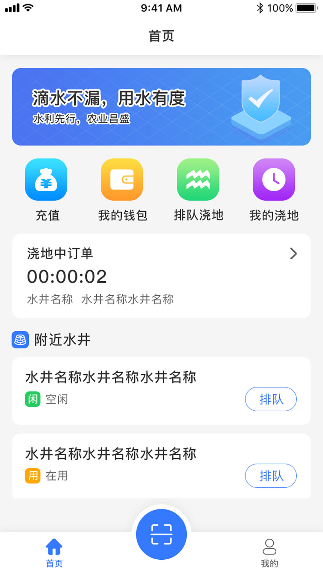 3、首页直观展示排队浇地区域、我的浇地区域及附近水井三大核心板块,让您对灌溉资源一目了然。