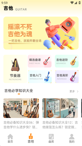3、吉他知识模块干货满满,从琴颈构造到音阶理论,图文结合直观易懂,帮你构建完整知识体系。