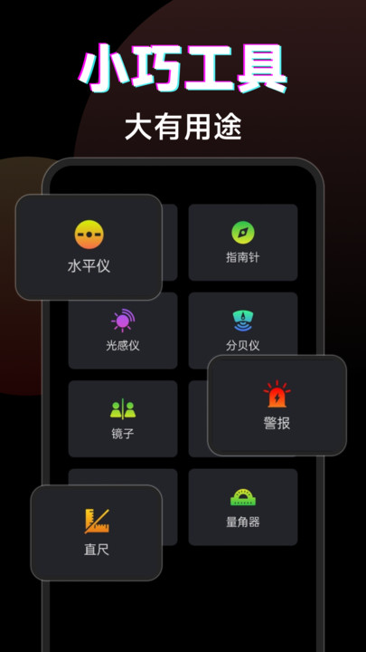 1、工具箱模块整合了水平仪、分贝仪、指南针、镜子等实用小工具,适配多种生活场景。