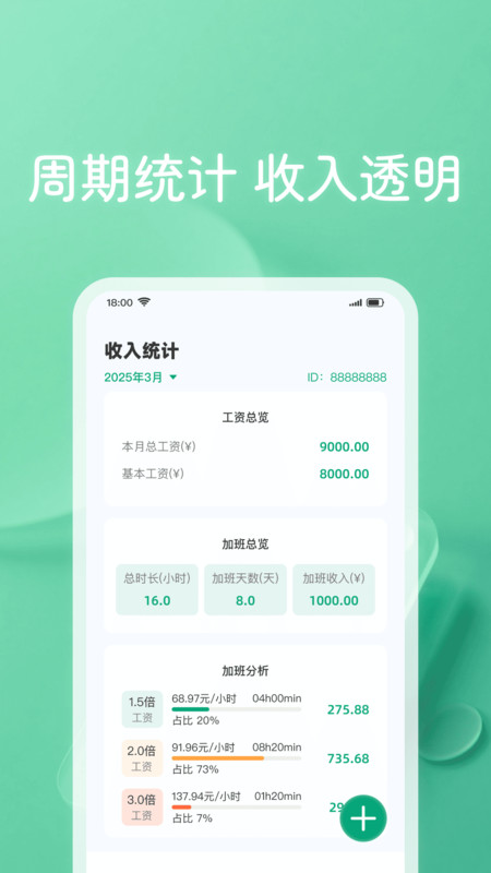 2、提供日历功能,在线可以查看每日的加班明细与收入信息。