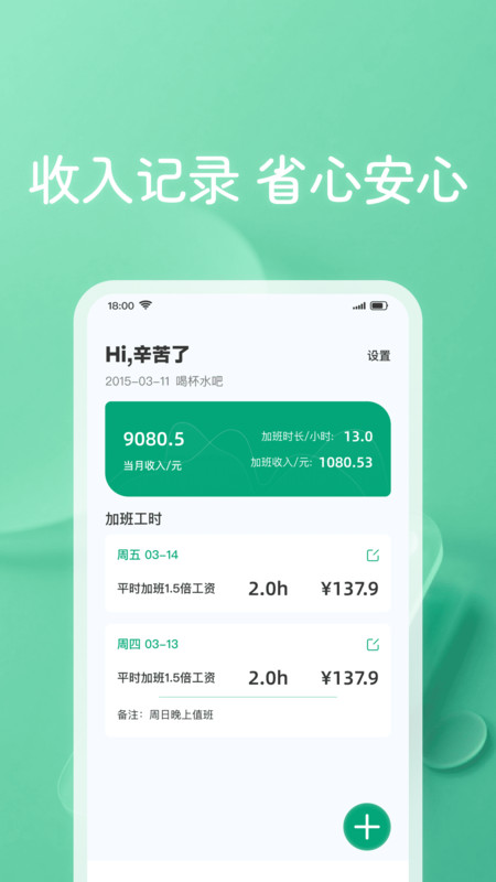 1、首页同步记录个人每天的加班工时,统计加班时长与加班收入数据。