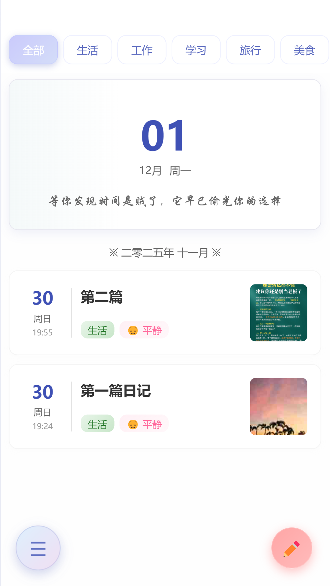 2、打开首页界面,无论是文字、图片还是心情标签,都能随心所欲地添加,一键保存,让灵感不流失。