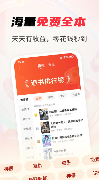 3、平台涵盖言情、悬疑、玄幻、都市、历史等多种题材的免费小说,任你挑选。