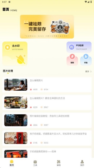1、进入首页,提供了去水印等功能,还有图片处理方法介绍。