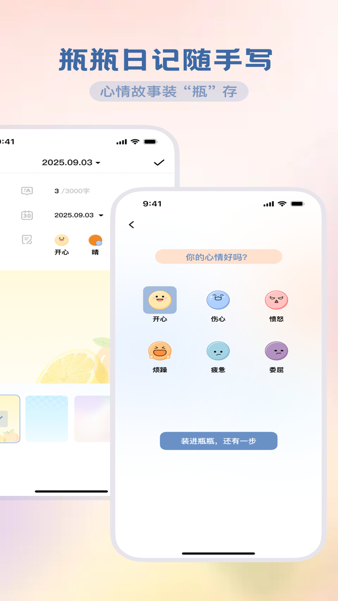 2、提供多种主题背景的瓶子作为日记载体,让记录心情如同封装故事,富有仪式感和视觉美感。