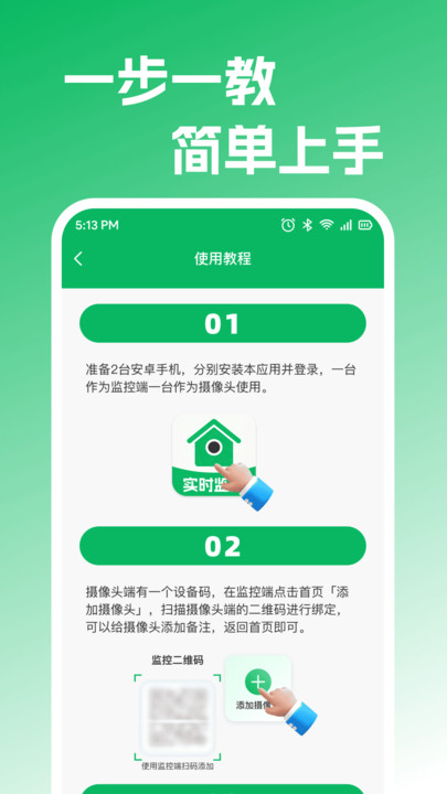 1、摄像头通电后自动广播配对信号,五秒内被app发现并配置网络,新手无需输入路由器账号密码,老人也能独立完成安装。