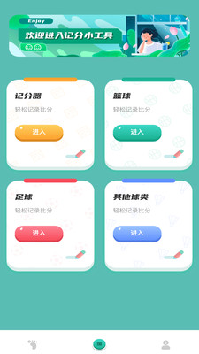 1、展示各类热门体育项目图标,点击您即将参与或关注的比赛类型,如篮球、足球等,进入专属计分界面。