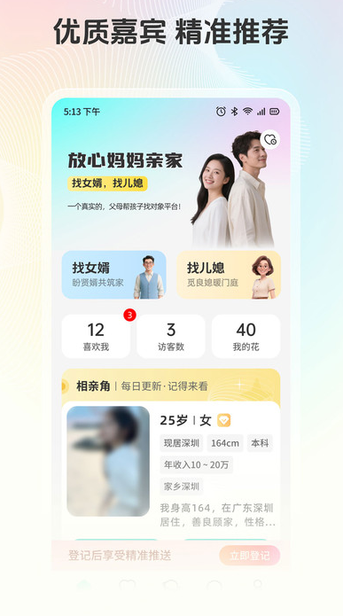 放心妈妈亲家app是一款为家长们提供的可以随时来这找儿媳妇,找女婿的软件,支持一键在线设置你的配对标签,系统将会根据家长设置的标签快速进行配对交友,家长们也可以自己进入交友社区进行挑选,挑选的过程中可以查看对方的信息资料,有合适的就可以在线聊一聊,如果聊的还不错那么也可以随时来这组织线下见面,将会大大提高交友效率。