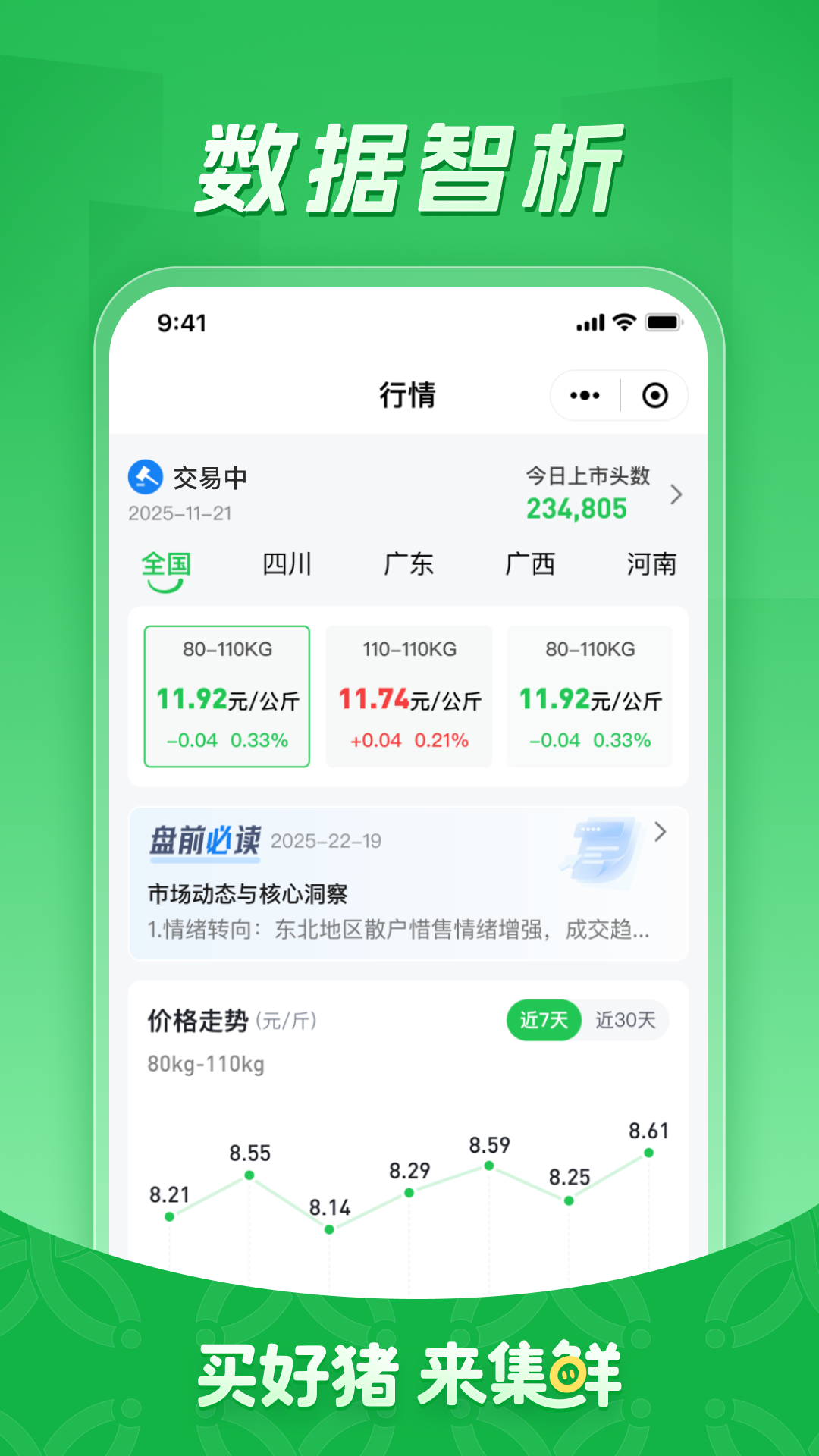 集鲜采猪app是一款专业的生猪交易服务平台,专注于为屠宰企业、贸易商及养殖户提供源头直采、在线竞价与行情分析的一站式解决方案。平台基于地理位置推荐附近资源,支持多种交易模式,并提供检疫证明、车辆洗消检测等合规保障。实时更新全国及各省份生猪行情,通过可视化图表清晰呈现价格走势与市场动态,助力从业者高效决策、安全交易。