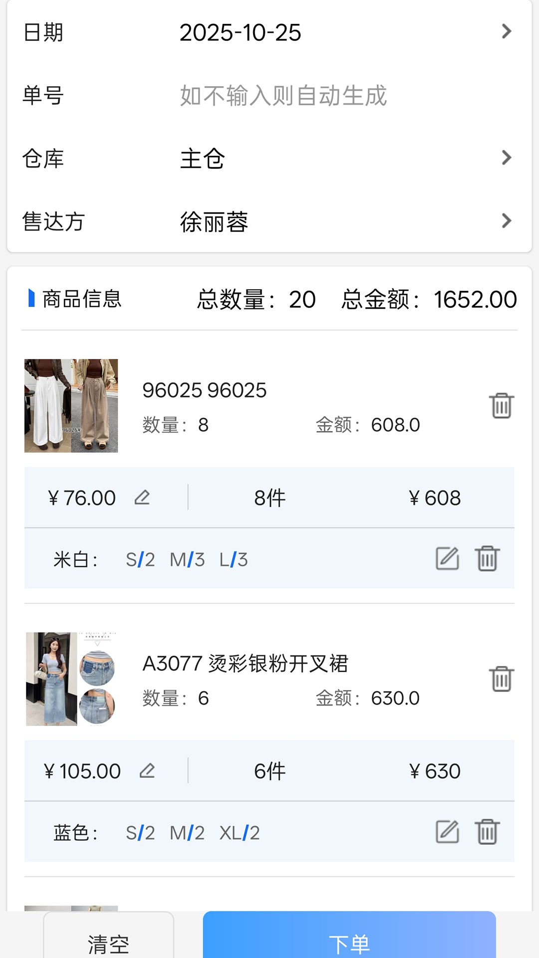 1、横排尺码录入界面让同款不同码集中一行显示,录单更直观且打印省纸,彻底告别传统竖排造成的翻页错行烦恼。