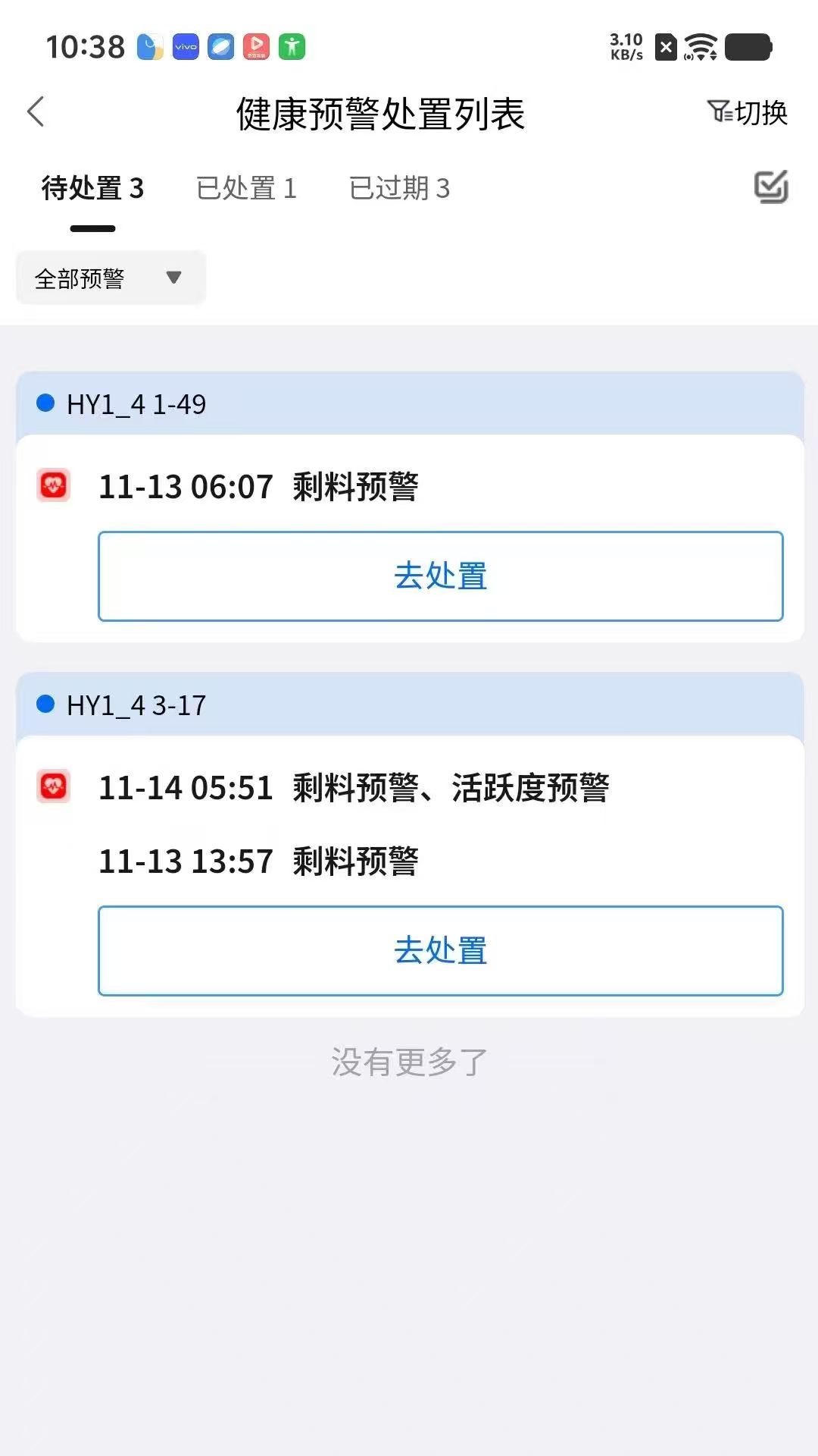 2、可按不同维度筛选和查看具体的健康、体况预警栏位列表,并可在预警详情页直接记录检查情况、处置方案及结果。