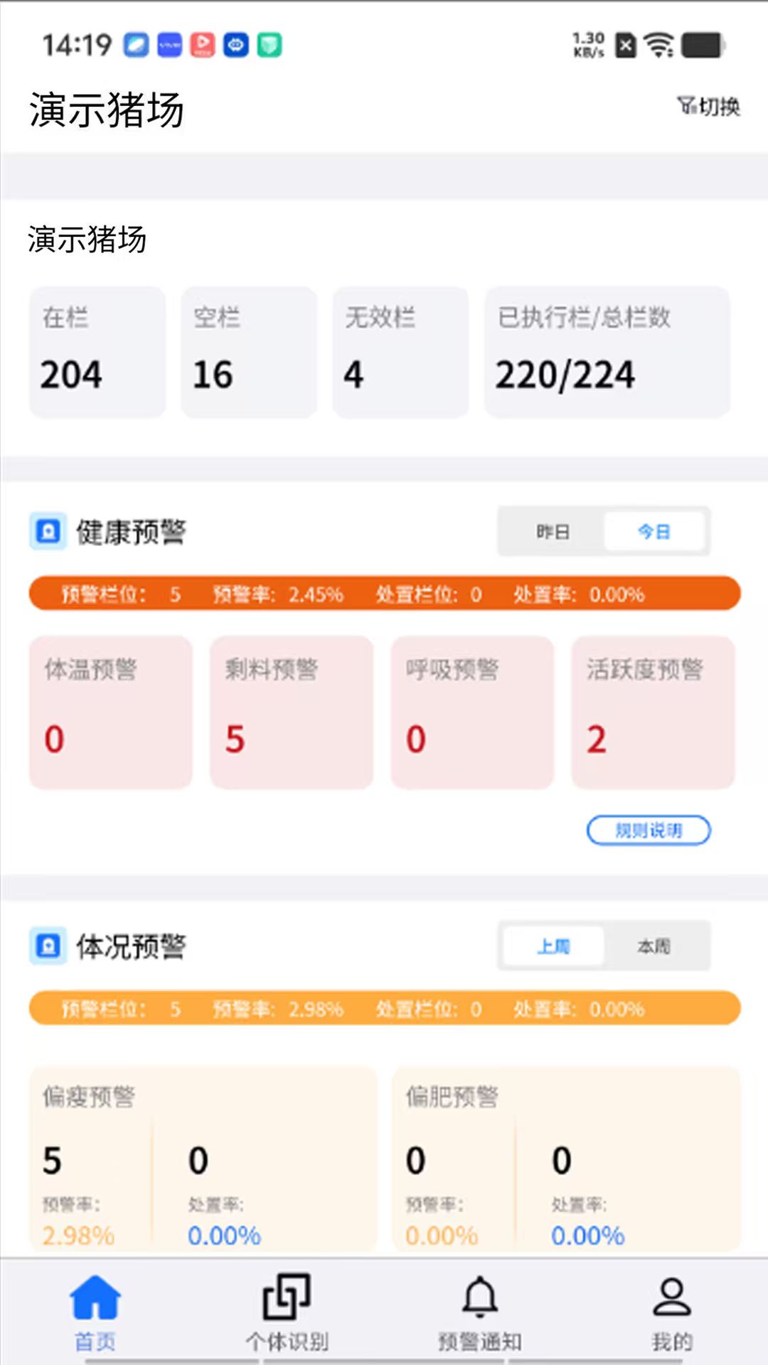 4、构建了从猪场、栋、舍、单元到房间的多层级监控框架,对健康异常与体况异常进行立体化预警与分析。