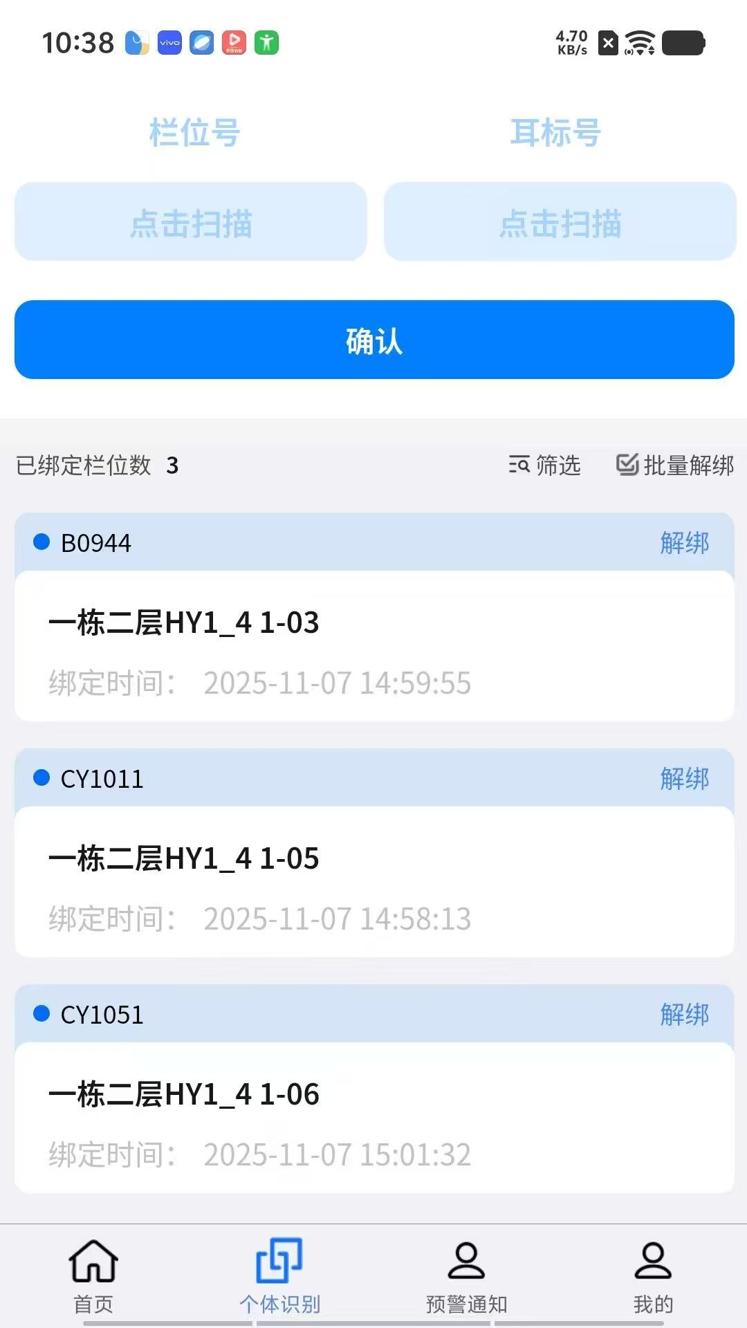 3、支持通过手机摄像头扫描耳标或栏位码,快速将个体识别号与具体栏位信息关联,实现从群体管理到个体追溯的无缝衔接。