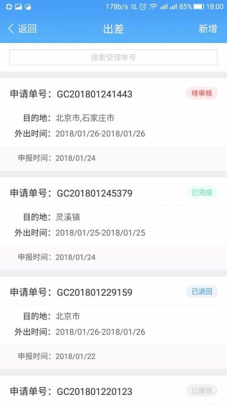 4、进入出差页面,可自行在线查看申请单号,了解状态。