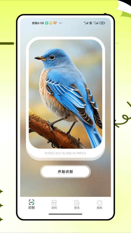 1、进入首页,点击开始识别即可快速的拍照识别各类鸟。