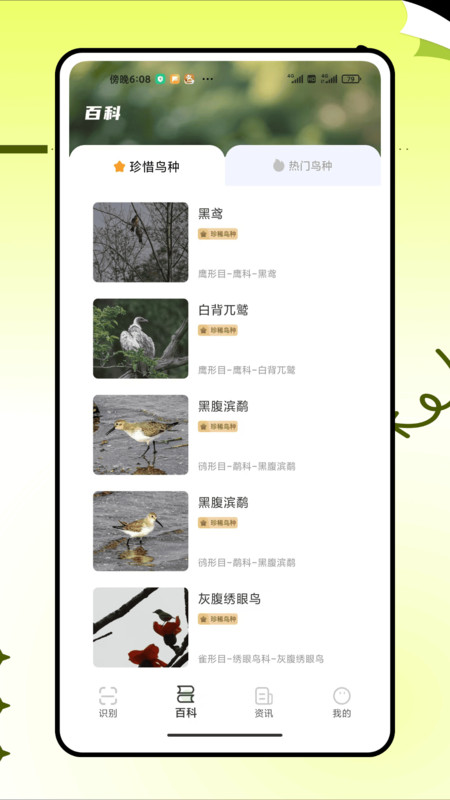 2、点击下方工具栏百科,页面中可以了解珍惜鸟种和热门鸟种等不同内容。