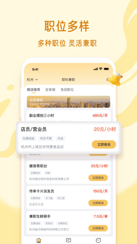 3、海量岗位覆盖线下促销、线上任务、家政服务、活动协助等多种生活化场景,满足多样化短期兼职需求。