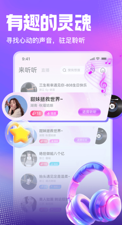 1、娱乐交友,温馨电台,歌曲点唱,游戏陪练...我们用声音在这里相遇!