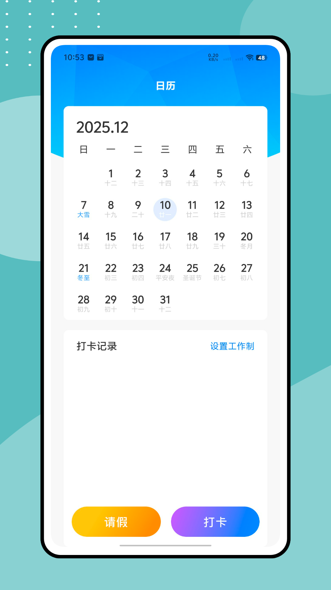 3、进入到【工具】,可以看到详细的考勤打卡情况,在日历上实时记录。