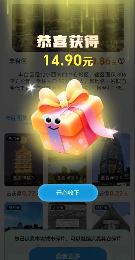 3、收集齐指定城市的所有碎片,可合成城市徽章,并兑换更丰厚的现金或实物奖励。
