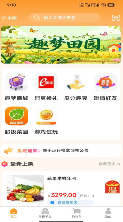 趣梦田园app是一款可以随时来这享受田园农家菜在线交易应用,支持随时来这把需要的商品加入购物车,用户可以快速在线完成交易,每天来这签到或者玩游戏也是可以获得田园金币奖励的,任你随时使用你的金币去兑换你想要的食材,在线兑换操作简单,不需要花钱就可以轻松吃到美味,当前玩法多多,娱乐性比较强,欢迎随时体验。