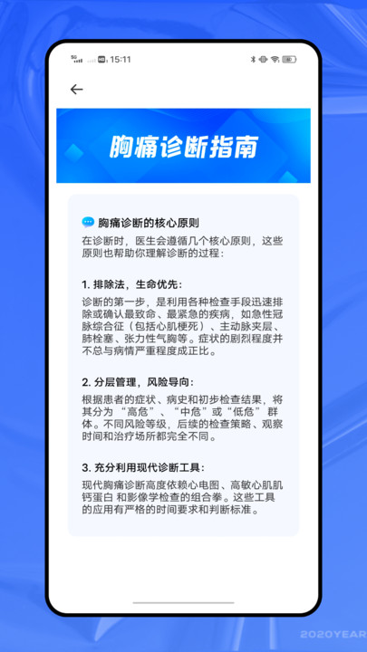 2、内置动画与短视频讲解急性心梗、主动脉夹层等高危胸痛的识别与自救技巧,用户利用碎片时间学习,提高全民急救素养。