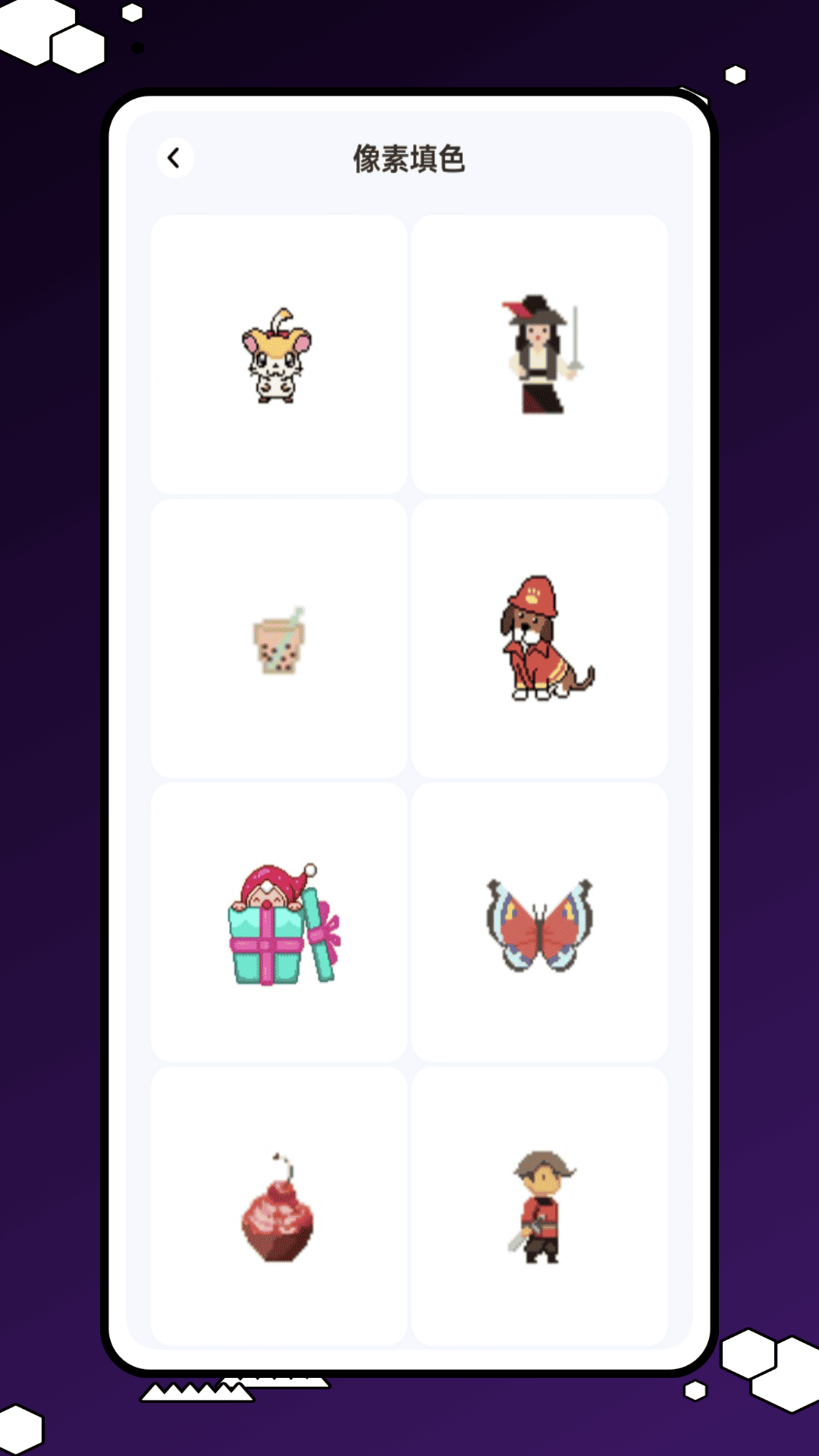 3、大量精心设计的像素画模板,用户通过简单的选色填格操作,即可创作出具有怀旧游戏风格或现代设计感的数字艺术作品。