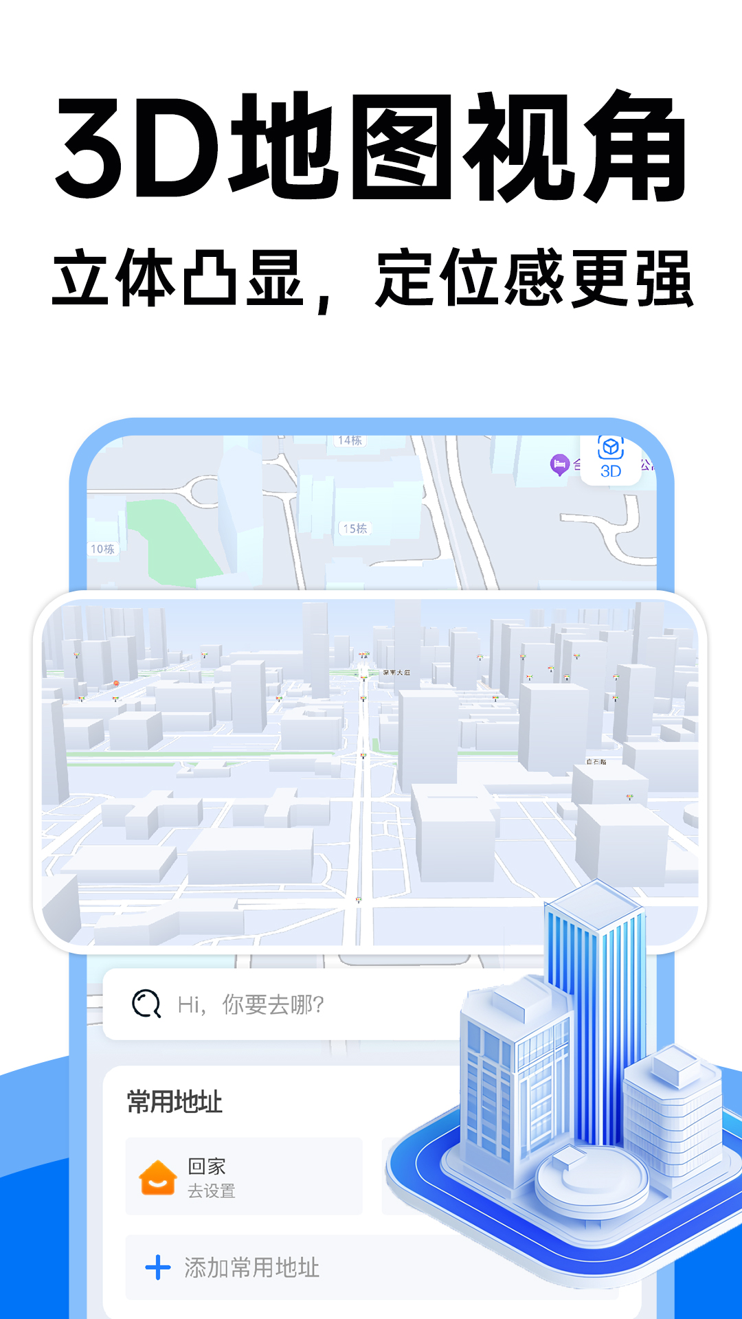 3、多视角地图服务,提供2D、3D及卫星地图等多种视图,让您对目的地周边环境一目了然,出行更加心中有数。