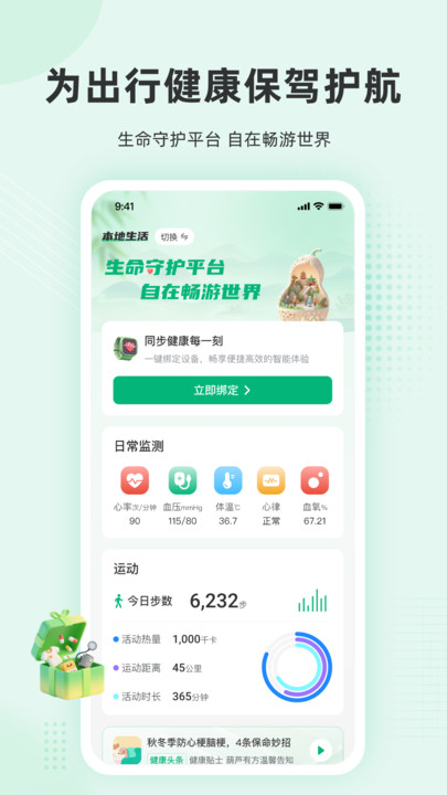壶芦有方APP是一款深度融合健康科技与旅行服务的创新型生命守护平台,app的核心理念是为旅行者的每一次出行提供全方位、智能化的健康保障。app通过连接可穿戴设备,实现心率、睡眠、压力等关键指标的持续监测与智能分析。平台依托人工智能与专业医疗资源,构建了一个覆盖行前、行中、行后的线上线下闭环服务生态,让用户无论身处何地,都能获得及时的健康支持与风险预警,真正做到自在畅游,健康无忧。