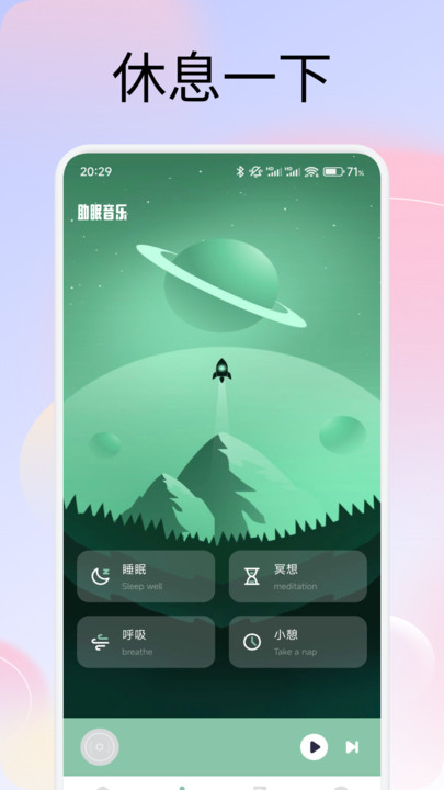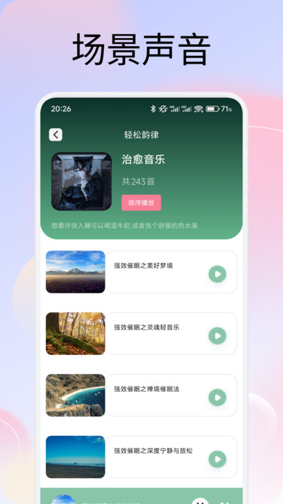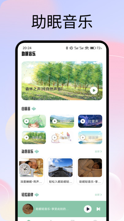 2、通过营造舒缓的听觉环境,有效引导神经系统放松,帮助用户快速进入睡眠准备状态。
