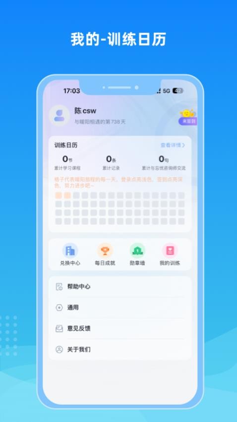 3、拥有详细的训练日历与成就系统,直观展现您的练习历程与进步,积累积极改变的正向反馈。