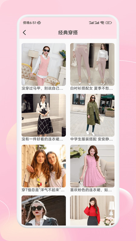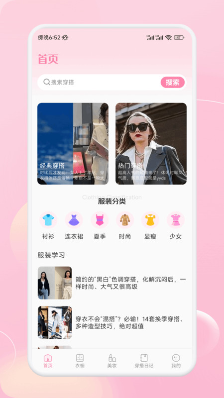 1、在首页可以浏览经典穿搭、热门穿搭推荐,以及各类服装分类信息。