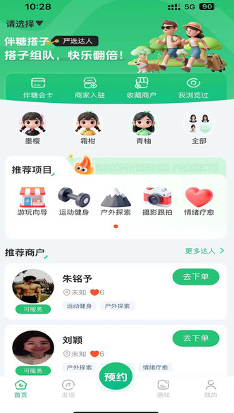 3、在首页上用户可以查看各种搭子服务,也可以及时选择搭子。