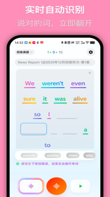 2、实时语音识别技术精准捕捉发音,逐词匹配理解程度智能翻开文本,告别盲目听读,精准定位薄弱点。