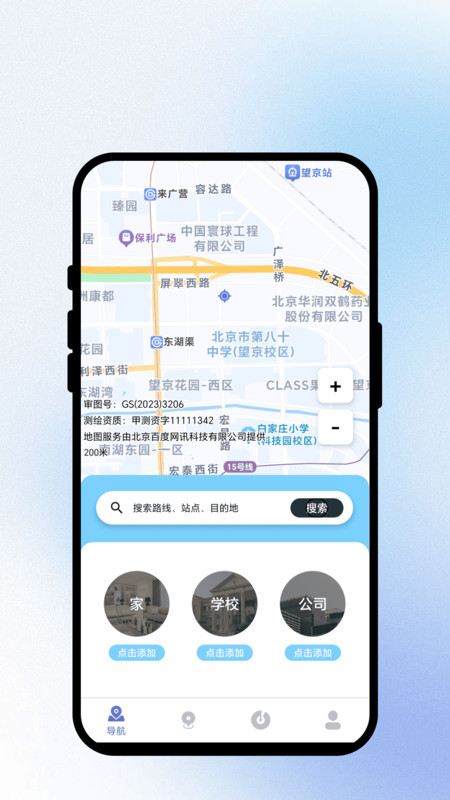 1、在导航页面,可通过搜索路线、站点或目的地进行导航,并可添加如家、公司等常用地址。
