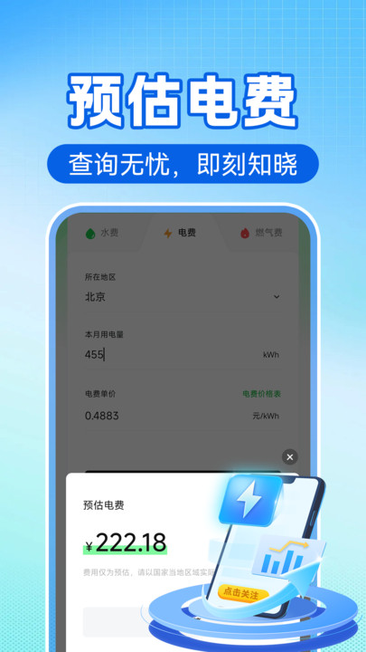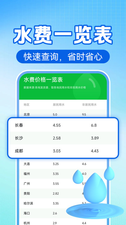 1、全国价目云端同步,300+城市水价电价实时更新,输入表底数即可秒级算出阶梯费用,比人工速算快十倍且零误差,彻底告别翻纸质价目表。