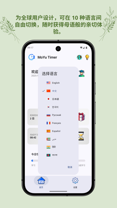 moyu timer软件是一款将时间感知、健康关怀与价值量化巧妙结合的创新时间管理工具。app不止于传统的计时与待办,其核心在于通过精美的桌面小组件与时间价值看板,将抽象的时间流逝转化为可视、可感的直观画面,从而深刻提升用户的时间管理意识。软件结合贴心的健康提醒与灵动岛等趣味交互,并引入独特的工作价值产出算法,帮助用户不仅管理时间,更理解时间的价值,是追求高效与平衡生活的现代人的智能伴侣。