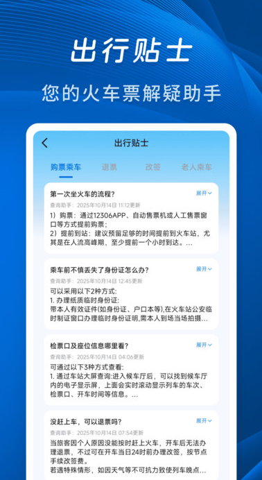 1、整合丰富的查询及出行攻略资源,涵盖购票时间节点、热门车次抢票技巧、退票改签规则。