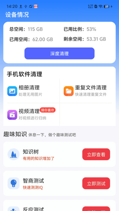 2、进入首页可以看到丰富的功能,点击即可进行深度清理。