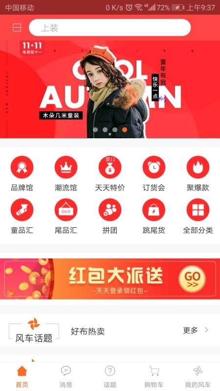 大风车商城APP是一款专注于童装销售的购物软件,APP以童装垂直品类为核心,通过品牌馆、潮流馆、热卖活动三大核心板块的精准布局,构建了“品质有保障、款式赶潮流、消费享优惠”的全链路童装选购生态。无论是追求品牌品质的家长,还是热衷时尚潮流的用户,亦或是注重性价比的消费者,都能在平台上找到契合需求的产品与服务。