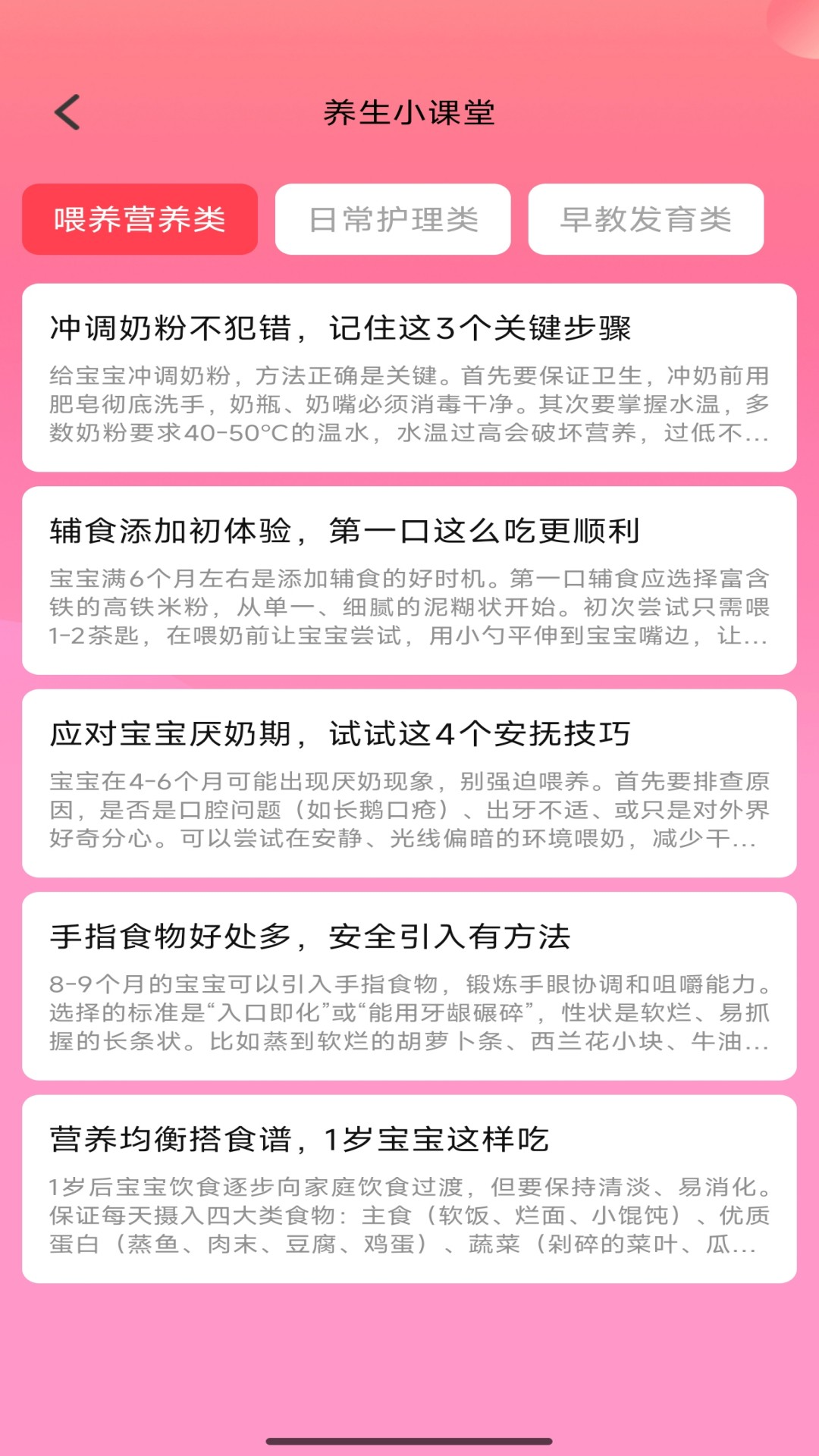 3、提供科学喂养营养指南,从母乳到辅食全程适配,结合宝宝月龄推荐方案,兼顾营养均衡与消化吸收。