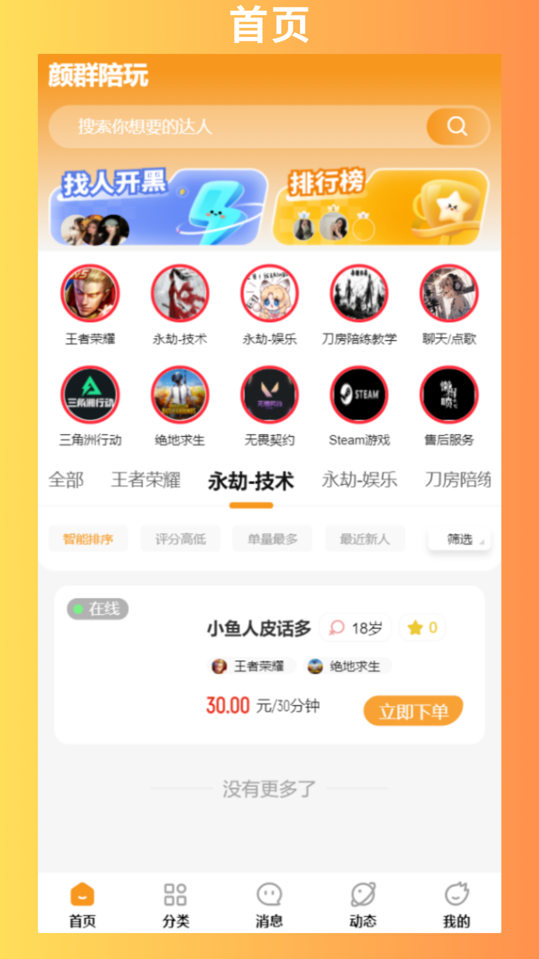 2、首页提供了各种陪玩项目,线上线下都有,可按需选择。