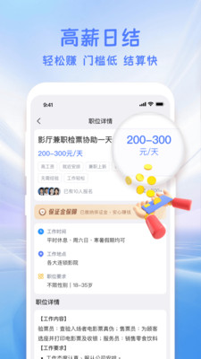 3、支持夜间、周末专属岗位筛选,精准适配学生、上班族碎片时间,兼顾主业与兼职,灵活平衡工作生活。