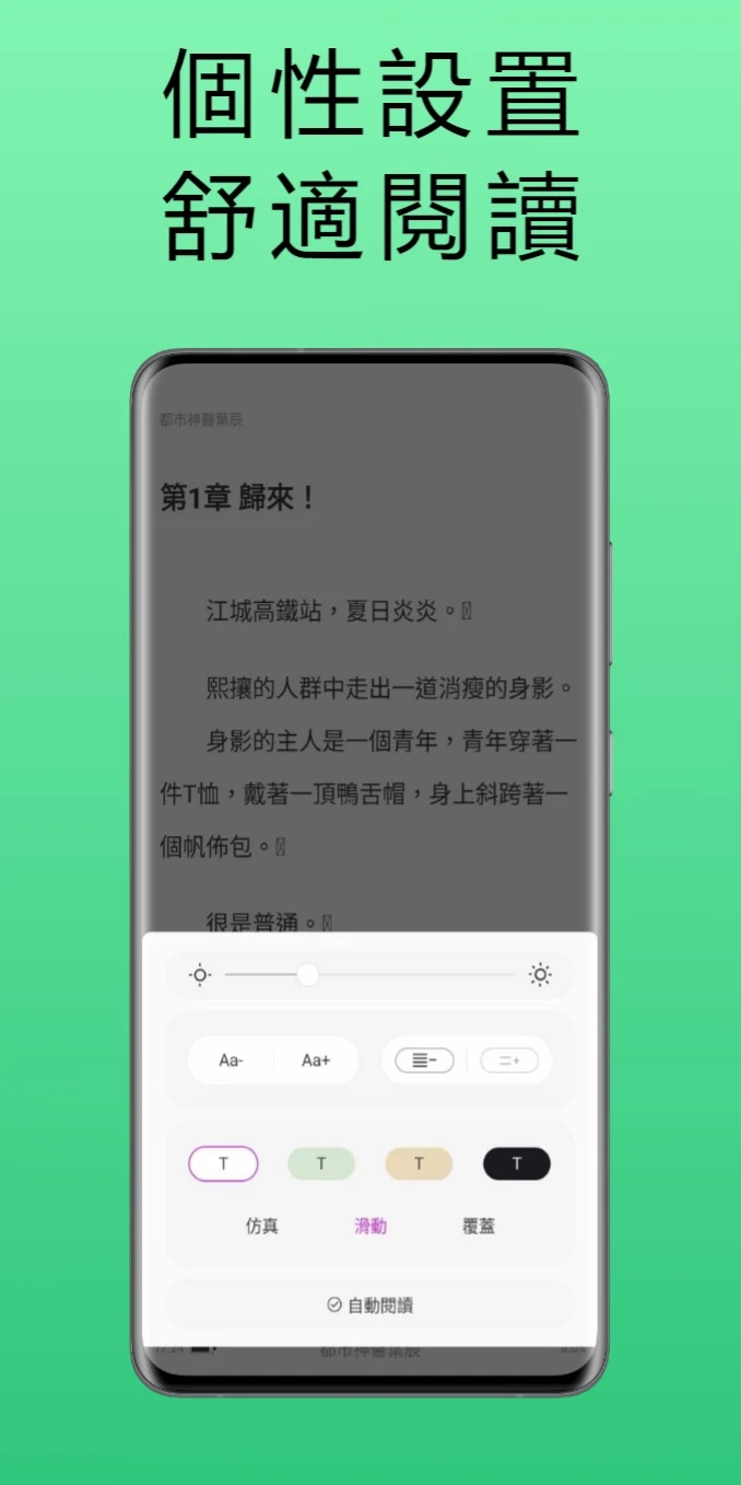 2、提供高度自由的自定义阅读设置,包括字体、字号、间距、背景颜色、翻页方式等。