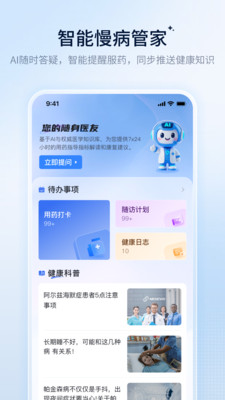 3、24小时健康助手,即时解答慢病护理、饮食运动等疑问,推送个性化健康科普,成为身边随时可及的健康顾问。