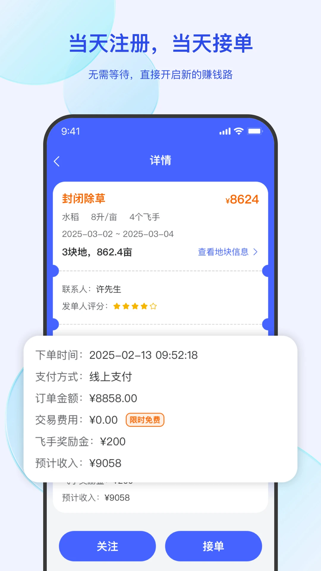 1、把农户需求与飞手资源放在同一平台,一键发单后系统按距离与机型自动匹配,十分钟内完成派单,告别以往电话找人的低效。