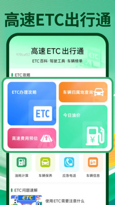 2、提供ETC攻略、车辆归属地查询、今日油价、高速费用预估等功能;