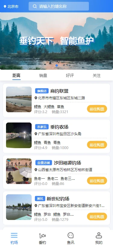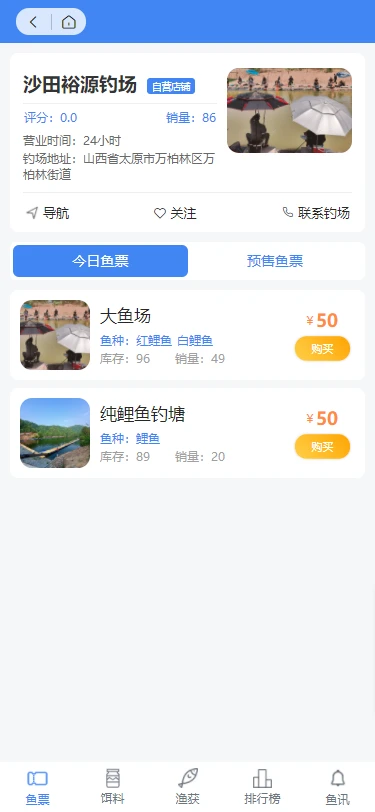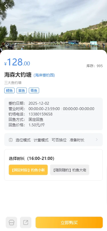 1、提供钓场门票在线购买,钓位支持自选与摇号两种模式,摇号不满意可当场重摇,公平透明免去排队争吵。