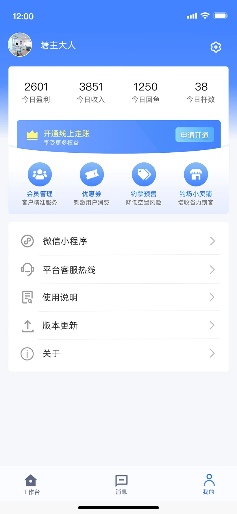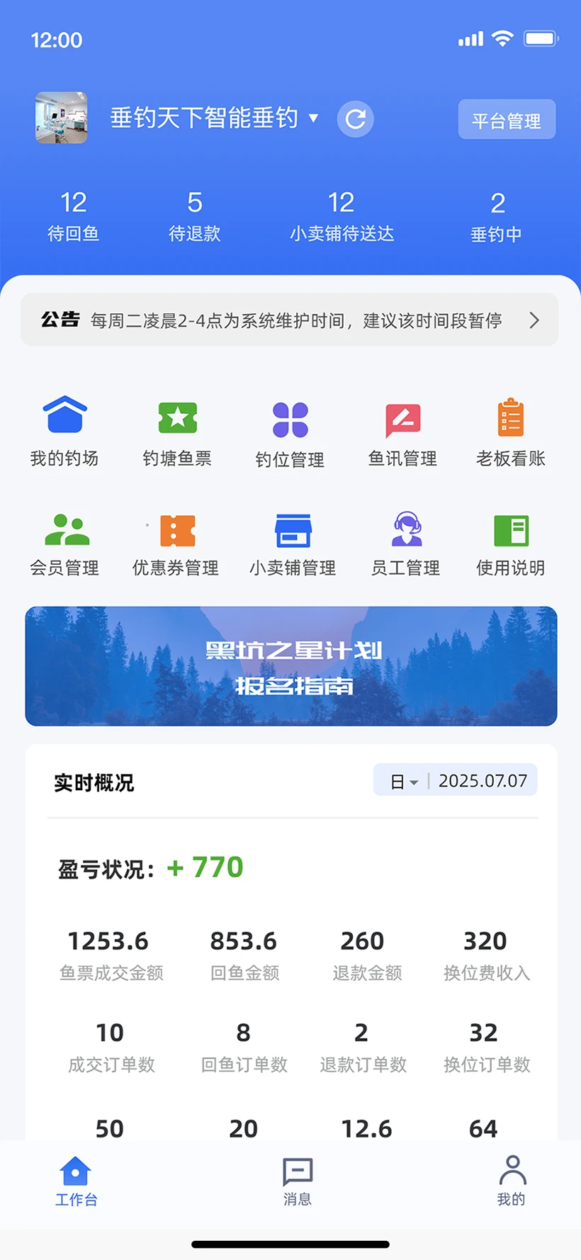 垂钓天下商户版app数据看板内置天气气压曲线并与历史收入叠加展示,老板一眼可知何天气最赚钱,据此提前在低温日推优惠,对冲客流下滑,员工权限分级开放,售票员无法查看财务报表,财务无法修改票价,账号操作全程留痕,合伙经营亦清晰可追踪,系统支持多门店切换,连锁钓场老板可在同一App内查看各场实时人数与营业额,无需分别登录,管理半径迅速扩大。