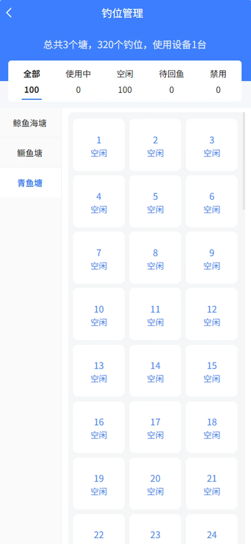 1、提供钓位电子地图,老板拖拽即可划分并命名钓位,手机端实时显示占用状态,避免纸质平面图带来的错位与重复销售。